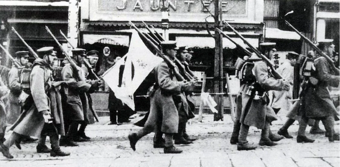 Pictured: Japanese rebel troops returning to their barracks after the failed February 26 coup, 29 February 1936, Chaen Yoshio, Zusetu 2/26 Jiken, Nihon Tosho Center, p. 181, (2001), obtained from Wikipedia Commons.